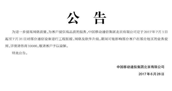 北京移动还表示,将认真核查,深挖原因,完善升级流程和应急措施,避免类似事件的发生,全力为广大客户提供更加优质的通信服务。