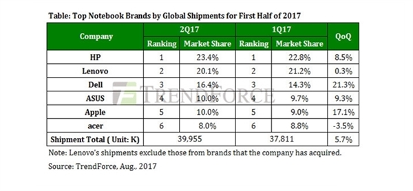 根据近日市场调研机构集邦咨询发布的全球笔记本电脑出货量报道,2017年第二季全球笔记本电脑出货量为3996万台,惠普以935万台的成绩雄踞第一,市场占有率达到了23.4%,大幅拉开与联想的距离。