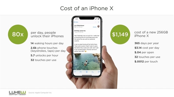 为了鼓励更多的用户去购买iPhone X手机,这不国外某网站给出了这样的算法,1000美元买iPhone X平摊到365天,每天的费用3.14美元,而如果具体到每次点开屏幕,每次费用4美分,而具体到每次触摸操作上,可能只有0.04美元。