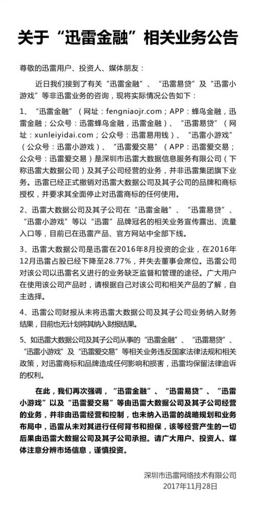迅雷方面称,“迅雷金融”、“迅雷易贷”、“迅雷小游戏”以及“迅雷爱交易”等由迅雷大数据公司及其子公司经营的业务,并非由迅雷经营和控制,也未纳入迅雷的战略规划和业务布局中,迅雷从未对其进行任何背书和担保,该等经营产生的一切后果由迅雷大数据公司及其子公司承担。