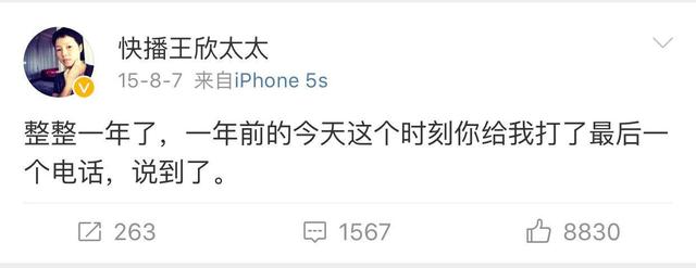 2015年8月7日23:17分,她发布微博:“整整一年了,一年前的今天这个时刻你给我打了最后一个电话,说到了。”