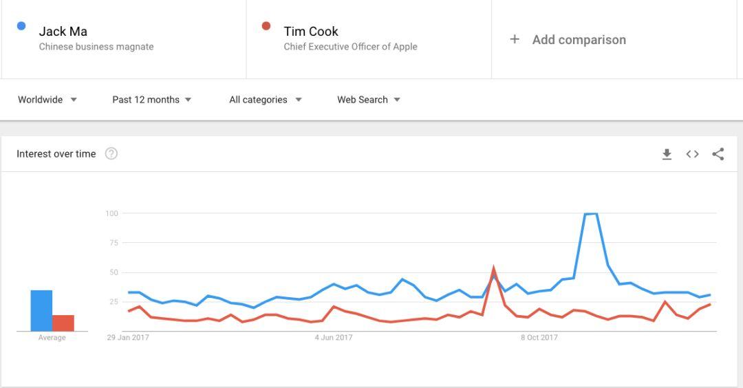 根据谷歌数据显示,在过去一年中,世界媒体对马云的关注度,远超世界第一大公司CEO Tim Cook