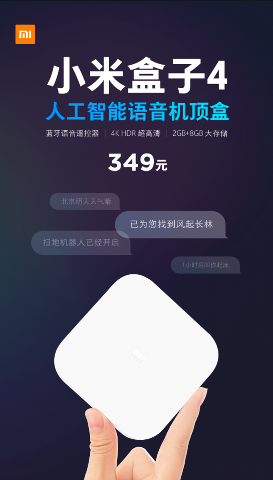 今天,作为小米电视2018年推出的第二款新品——小米盒子4正式发布,纯白外观设计,简约轻薄,硬件延续小米高配特点,四核处理器,支持4K视频解码,直接预置人工智能语音系统,一键语音轻松操作。该机售价349元,将于1月29日10点在小米商城、小米之家、有品、京东、天猫、苏宁易购等全渠道开启预约,2月1日正式开售。