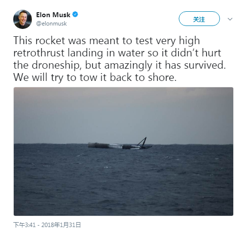 马斯克在推特上写道: “这枚火箭的目的是要测试非常高的制动推力水面着陆,所以它不会伤害无人船,但是令人惊讶的是它已经存活下来了。我们会试着把它拖回岸边。”