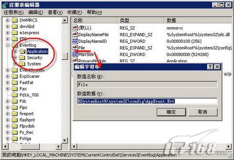 点击“开始 | 运行”,输入“regedit”并回车,即打开注册表编辑器。找到HKEY_LOCAL_MACHINE\SYSTEM\CurrentControlSet\Services\Eventlog,三个日志都在其下。还是以应用程序为例,选中“application”后,右侧窗口中有个名为“file”的项,它的原始数据是“%systemroot%\system32\config\appevent.evt”,即系统默认的路径与文件名。双击它,在弹出的窗口中修改其值为“d:\01\02\03\04\05\06\07\appevent.evt”,依次类推,再分别把Security和System项下的“file”键更改为“d:\01\02\03\04\05\06\07\secevent.evt”和“d:\01\02\03\04\05\06\07\sysevent.evt”,最后按F5刷新一下,关闭注册表。如图2所示。