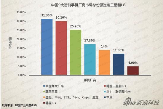 韩国产业联盟(FKI)最新发布的报告显示,今年第二季度,中国九大手机制造商所占的全球市场总份额超过了韩国三星和LG的总份额。