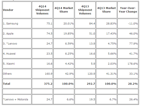 国际数据研究公司IDC近日发布了2014年第四季度全球智能机出货量报告,手机市场出现了怎样的变化呢?