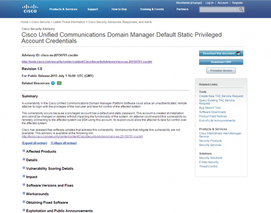 据了解,这个漏洞利用起来非常简单,攻击者可以通过SSH远程连接到统一CDM平台,用具有root权限的账户身份登录,如此一来,攻击者就有可能控制整个思科统一CDM平台,并能窃取该平台上管理的所有数据。