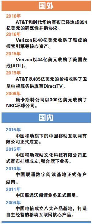 去年,AT&T以485亿美元的价格收购了卫星电视服务供应商DirectTV,变身成为美国有线电视行业的巨头。AT&T的竞争对手Verizon则在去年以44亿美元收购了美国在线(AOL),今年以48亿美元收购了雅虎的搜索引擎等核心资产。