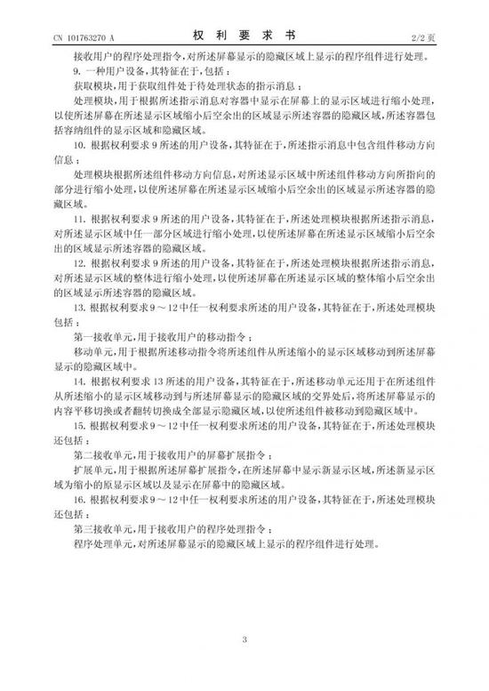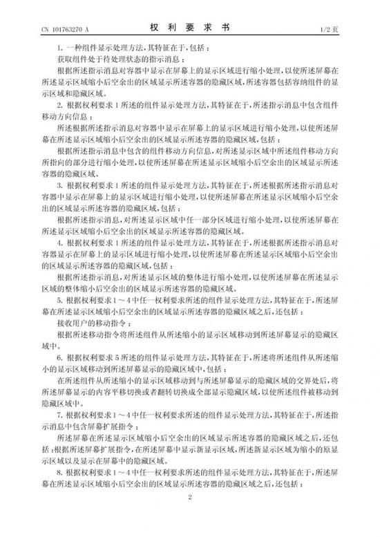 笔者通过国家知识产权局的中国及多国专利审查信息查询找到了ZL201010104157.0的专利名称为:组件显示处理方法和用户设备。