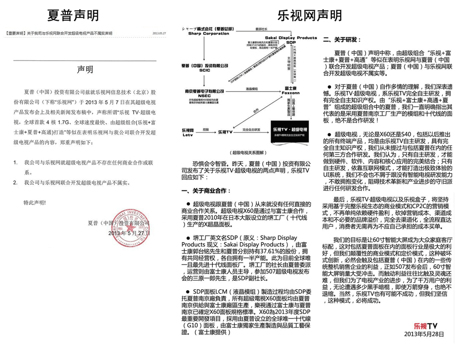 5月28日下午,乐视发表澄清公告,称超级电视跟夏普(中国)从来就没有任何直接的商业合作关系。[详细]