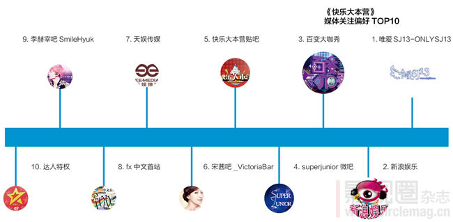 相比之下,在《快乐大本营》观众那里,一切都纯粹多了。《快乐大本营》一贯强调其以观众为主体的“娱乐天下”的节目宗旨,这一点在其观众个人偏好度TOP50榜单中亦有彰显。榜单中除了明星还是明星,内地、港澳台、日韩等地全面覆盖。观众关注的媒体类榜单,放眼望去则尽是明星贴吧、粉丝后援会等类似的账号。