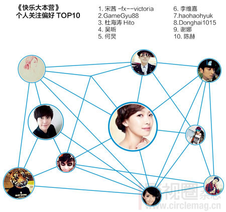 以《快乐大本营》为例,在每周六节目首播日的相关微博中,《快乐男声6强华丽来袭 桓桓破功“甄嬛体”上身》以37904条微博的战绩荣登榜首,成为首播最受关注的节目。《吸血鬼伊恩秀骑技》(8月24日)和《何炅宋茜互喂美食 陈晓现场表白赵丽颖》(8月17日)分别以34608和29664的提及量排名第二和第三。