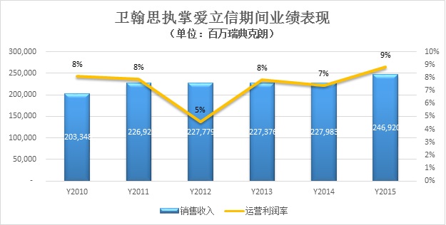 卫翰思于2010年1月1日正式就任爱立信CEO,到2016年为止共发布过6次年报,从这6份年报披露的公司财务数据来看,在卫翰思执掌爱立信的6年多时间里,其创造的业绩实在是差强人意:销售收入在6年间仅增长了20%,且始终在2000亿到2500亿瑞典克朗(约300亿美元)间徘徊,而运营利润率则一直低于10%。