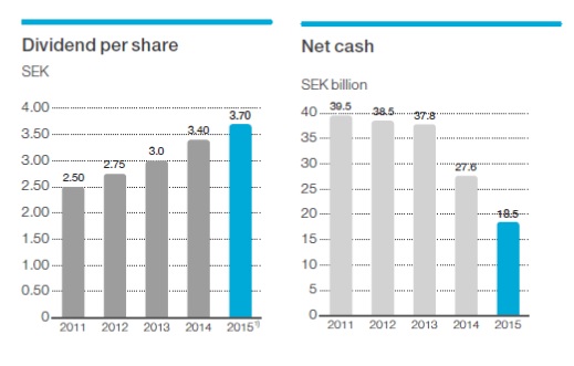 如果说卫翰思执政爱立信期间有做得让股东满意的事,逐年提高的股东分红无疑是最大的亮点。从2015年财报披露的数据来看,从2011年到2015年间爱立信每股现金分红始终保持着10%左右的增幅,五年间涨幅达到了48%,更多的现金分红无疑会受到投资市场的欢迎,这也是爱立信在股票市场上股价表现较为稳定的原因之一。