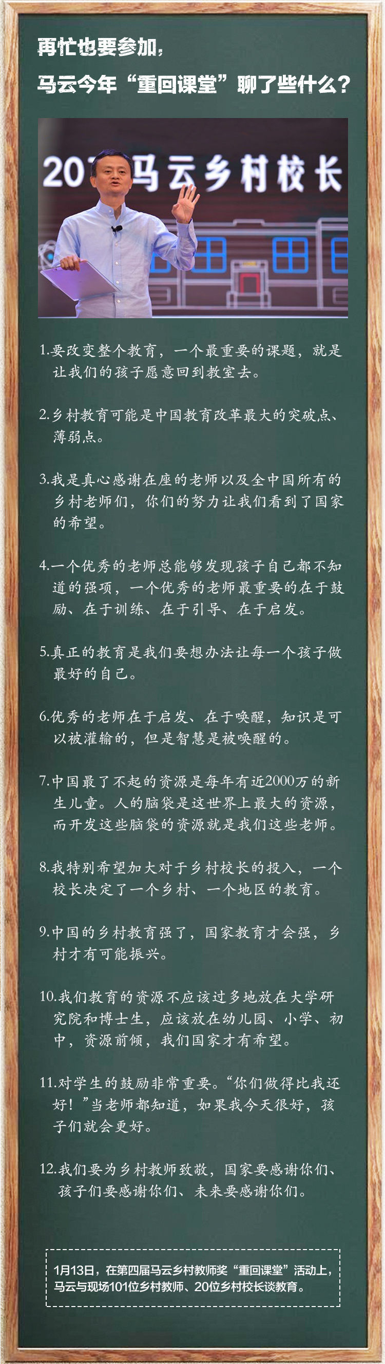 今年的颁奖典礼邀请了101位乡村教师和20位乡村校长出席,马云为他们颁奖并发表了题为《重回课堂》的演讲,在这个“新年第一课”中,马云金句频出。[详情]