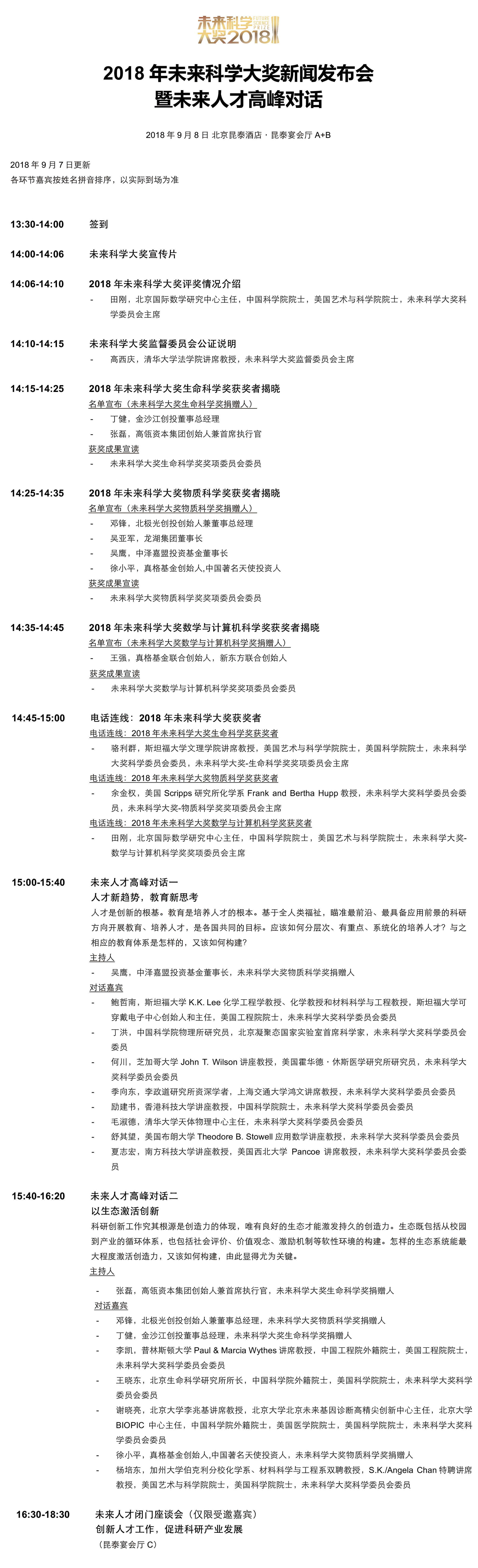 第三届未来科学大奖获奖名单8日公布,并与获奖者现场连线。[详情]