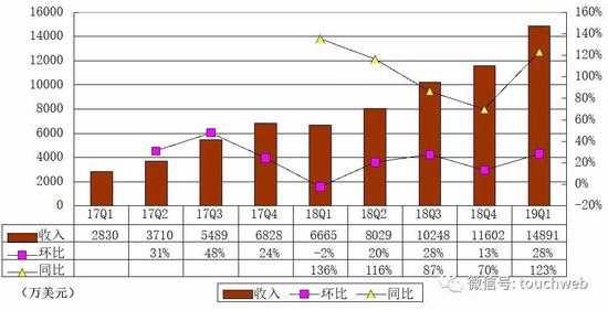 斗鱼2019年第一季度营收14.89亿元,同比增长123%。其中,来自直播业务的营收达13.541亿元,比上年同期的5.434亿元增长149.2%。