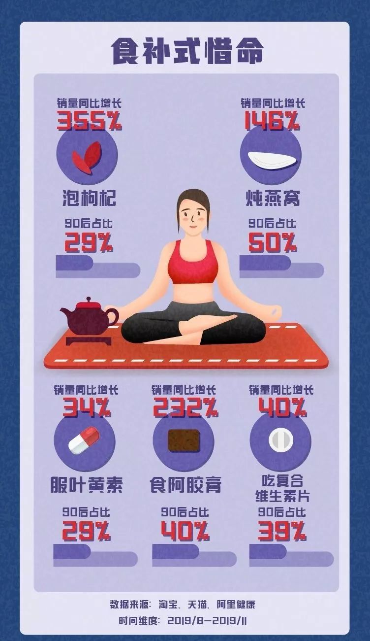 淘宝发布《90后惜命指南》:食补、运动、医疗成最受欢迎方式。怕死又作死,一边“敷着最贵的面膜,吃着最贵的保健品”,一边“熬着最晚的夜”,小巴觉得,真的是十分90后了。