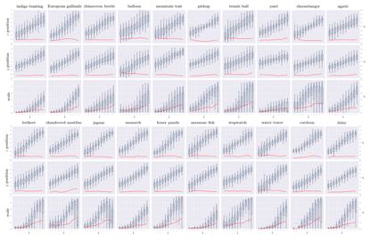 图1:用于训练的ILSVRC数据集的10个类别(顶部)和用于验证的其他10个类别(底部)的定量结果。蓝色表示测量到的变换参数的分布,红色表示分布相对于t的标准差。请注意,对于大尺度,该算法似乎失败了。然而,这种现象很可能是由于显著性模型的性能较差,所关注的对象几乎覆盖了整个图像(比例≈1.0)。(放大后效果最佳)