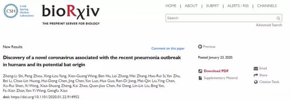 1月23日,在bioRxiv预印版平台上,石正丽团队发表了一篇题为《Discovery of a novel coronavirus associated with the recent pneumonia outbreak in humans and its potential bat origin》的文章。