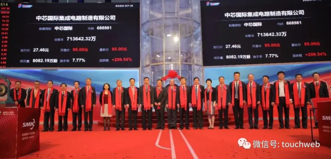 中芯国际开盘价为95元,较发行价上涨245.96%;此后,股价有所回落,涨幅仍超过200%,收盘时股价为82.92元,较收盘时上涨201%,市值为5917.52亿元。