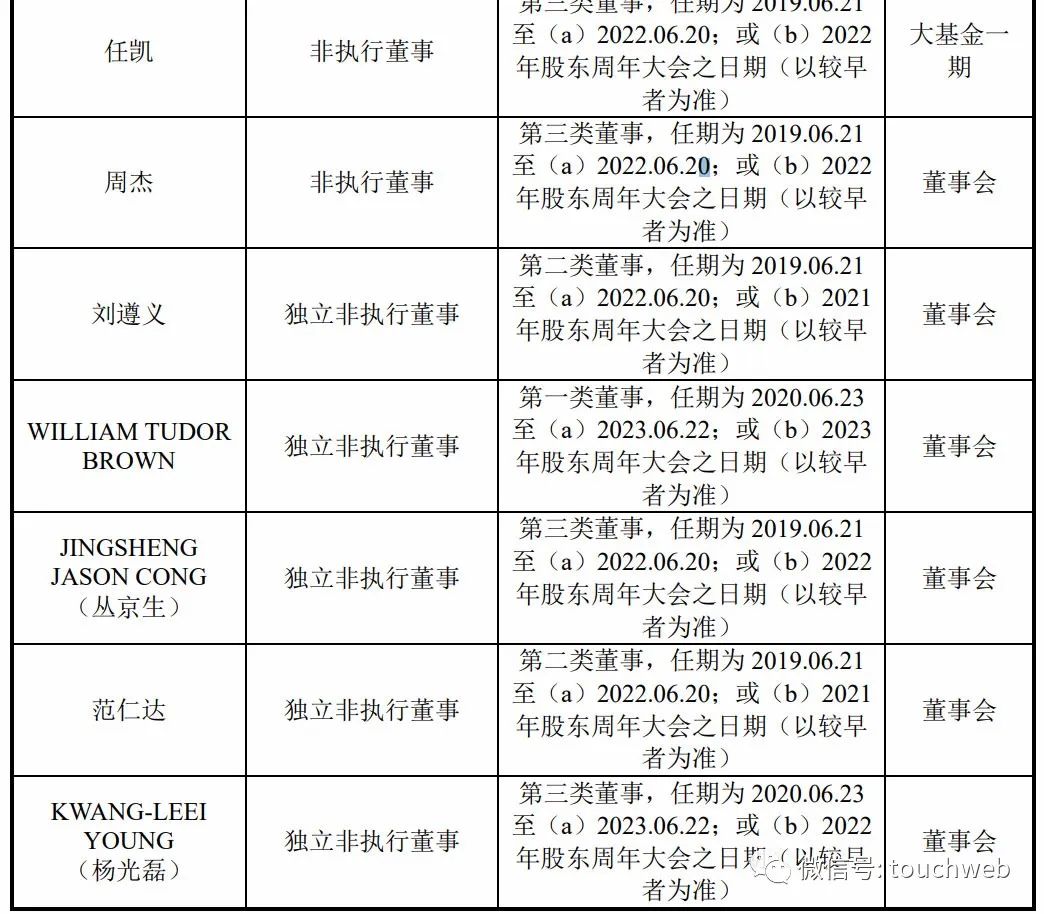 中芯国际非执行董事为童国华、陈山枝、路军、任凯、周杰;独立非执行董事为刘遵义、WILLIAM TUDOR BROWN、JINGSHENGJASON CONG(丛京生)、范仁达、KWANG-LEEI YOUNG(杨光磊)。