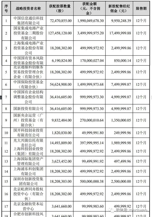 中芯国际科创板上市过程中,一共有29家大型机构参与了认购,其中,中国信科认购了19.9亿元,国家集成电路产业 投资基金二期股份有限公司认购34.99亿元。
