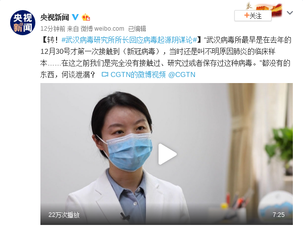 “武汉病毒所最早是在去年的12月30号才第一次接触到(新冠病毒),当时还是叫不明原因肺炎的临床样本……在这之前我们是完全没有接触过、研究过或者保存过这种病毒。”都没有的东西,何谈泄漏?@CGTN