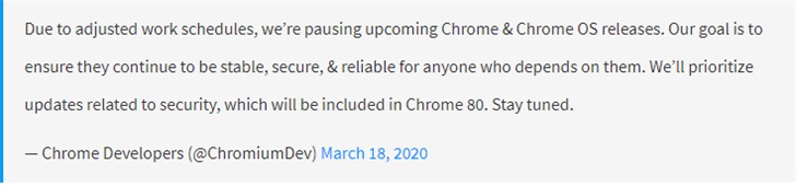 “由于工作日程的调整,我们暂停了即将推出的Chrome和Chrome操作系统版本。我们的目标是确保依赖于它们的任何人继续保持稳定、安全和可靠。我们将优先考虑与安全相关的更新,这些更新将包含在Chrome 80中。敬请期待。”