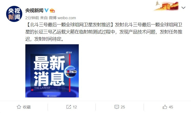 IT之家 6 月 16 日消息 据央视新闻报道,发射北斗三号最后一颗全球组网卫星的长征三号乙运载火箭在临射前测试过程中,发现产品技术问题,发射任务推迟,发射时间待定。