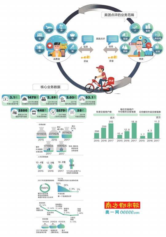 从财报上看,美团2017年总营收339亿,经营亏损38.2亿,而除了到店业务占据超过70%份额的市场主导地位,其还在打车对标滴滴、酒旅对标携程、外卖对标饿了么,甚至还有新零售的阿里,漫长的战线与形形色色的“敌人”,南都记者也从其招股书中看到美团的底气所在。