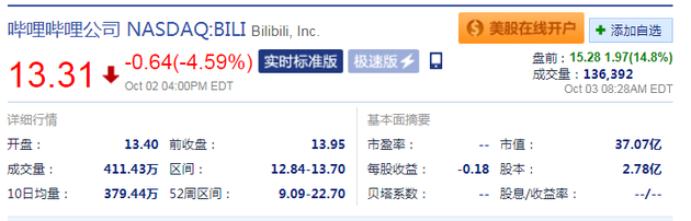新浪科技讯 10月3日晚间消息,截至北京时间20点28分,哔哩哔哩(NASDAQ:BILI)盘前大涨14.8%,报15.28美元。