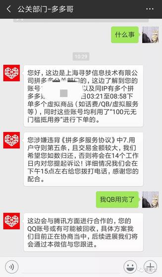 有人在微信群里晒出截图,疑似拼多多公关的人在跟撸羊毛大佬沟通,希望其返回撸的Q币,否则充值的QQ号码可能会被回收。