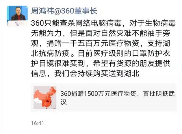 周鸿祎表示,360只能查杀网络电脑病毒,对于生物病毒无能为力,但是面对自然灾难不能袖手旁观,捐赠一千五百万元医疗物资,支持湖北抗病防疫。目前医疗级别的口罩防护衣护目镜很难买到,希望有货源的朋友提供信息,我们会持续购买送到湖北。