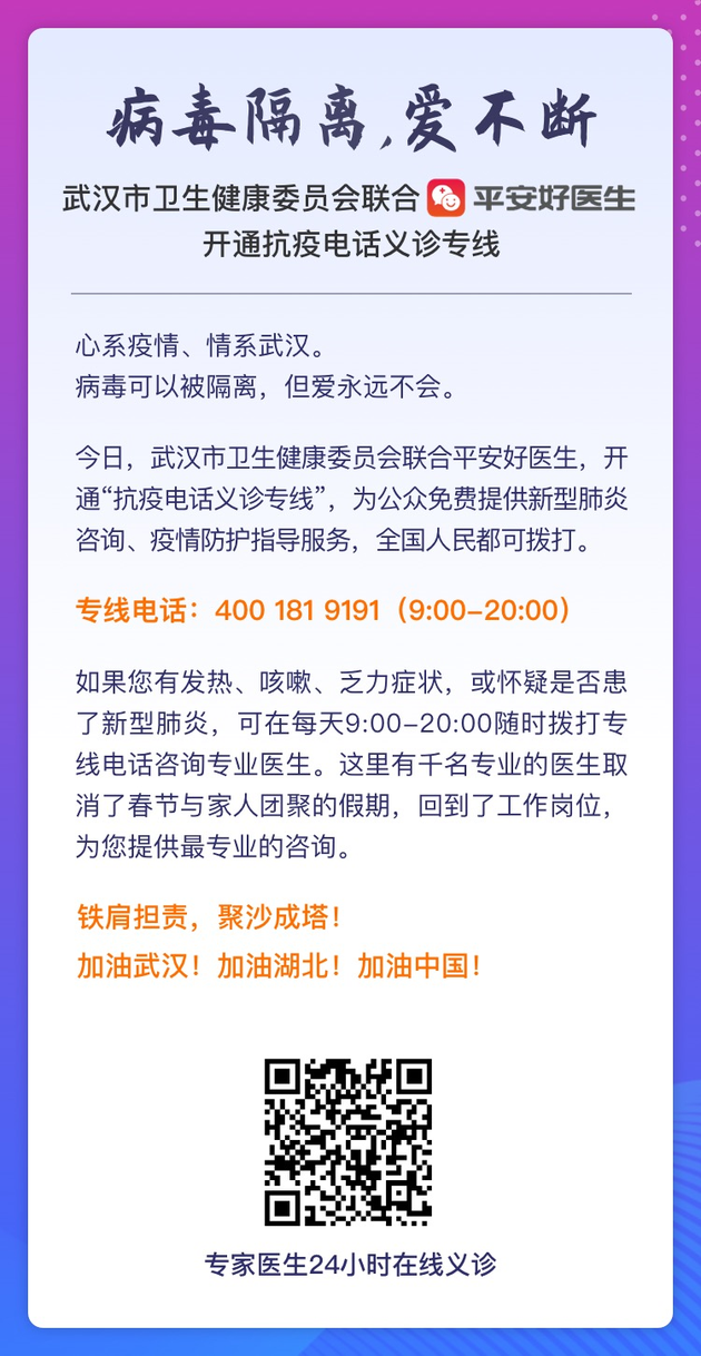 新浪科技讯 1月26日晚间消息,武汉市卫生健康委员会今日联合平安好医生,开通“抗疫电话义诊专线” 400 181 9191,为公众免费提供新型肺炎咨询、疫情防护指导服务,全国人民都可拨打。