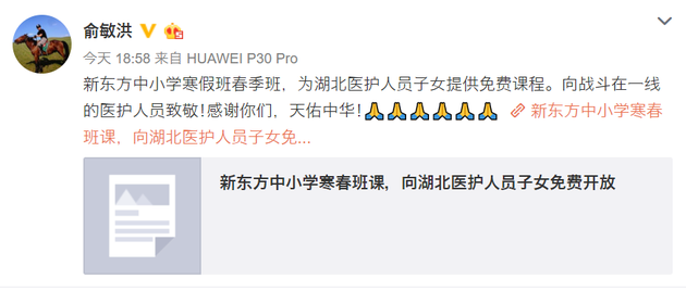 俞敏洪表示,“向战斗在一线的医护人员致敬!感谢你们,天佑中华!”