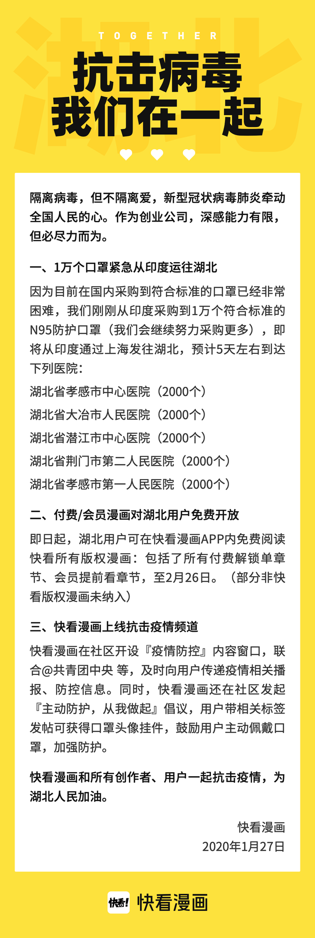 新浪科技讯 1月27日下午消息,快看漫画宣布,紧急从印度采购1万只口罩支援湖北,同时其版权作品面向所有湖北用户免费,并在端内开设“疫情防控”窗口,向用户传递疫情相关信息。