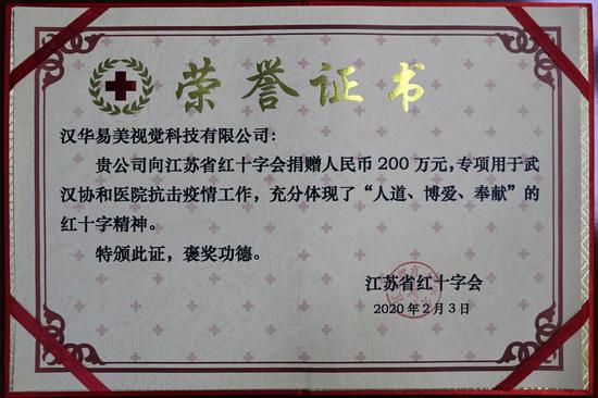 新浪科技讯 2月7日上午消息,据江苏省红十字会官网报道,视觉中国全资子公司汉华易美视觉科技有限公司向江苏省红十字会捐款人民币200万元,定向用于武汉协和医院抗击疫情工作。