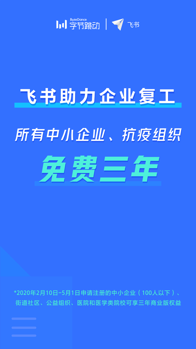 具体为飞书针对2020年2月10日-5月1日期间,申请并注册的中小企业(100人以下)、街道社区、公益组织、医院和医学类院校等组织,免费提供3年商业版免费权益。