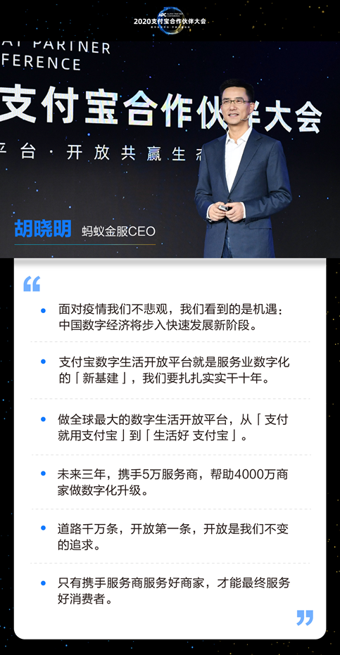 蚂蚁金服CEO胡晓明表示,支付宝升级成为数字生活的开放平台,就是要打造服务业数字化的“新基建”。