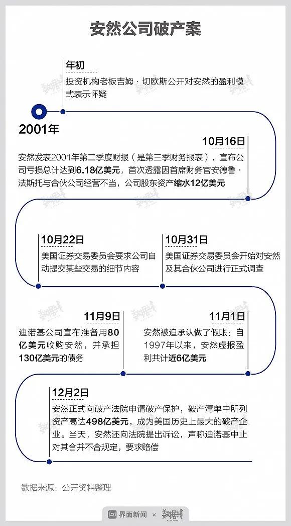 2001年年初,能源巨擘安然(Enron)盈利模式遭到质疑,10个月后安然公司公布亏损数据,并在随后承认数据造假。当年12月,安然正式向法院申请破产保护。