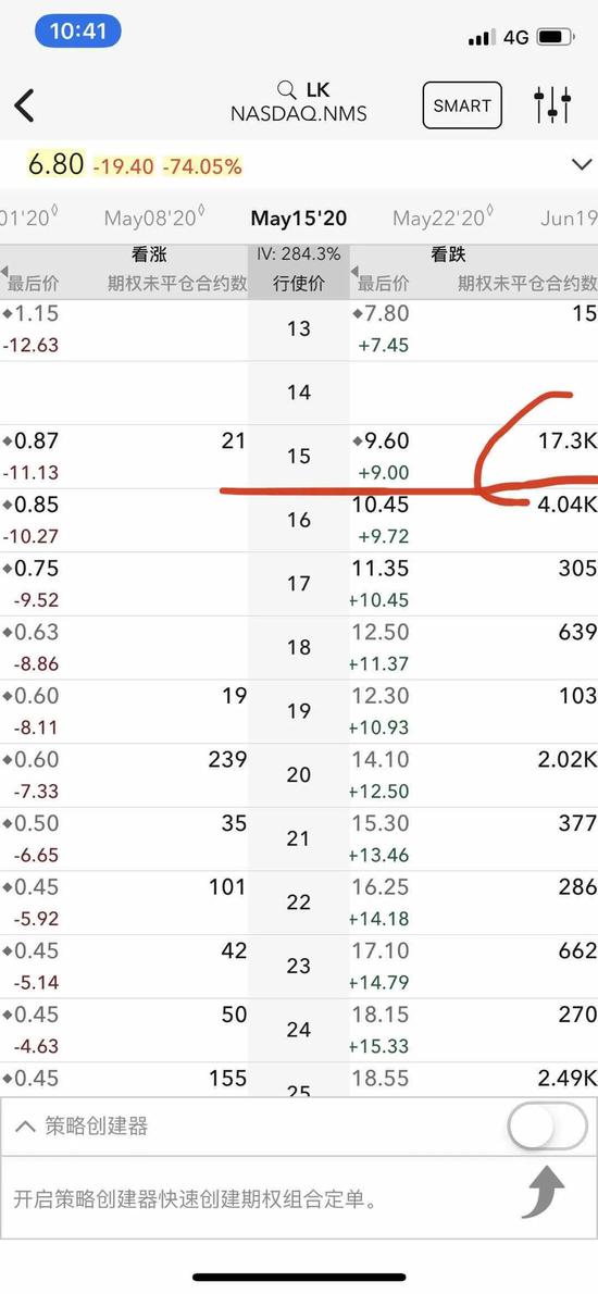 我专门找了最近的主力合约(4月17号和5月15号),因为只有主力合约能有这么大的承接能力,然后找所有行权价的未平仓合约数哪个最大,发现在5月15号的行权价15的合约上面有巨额成交量: