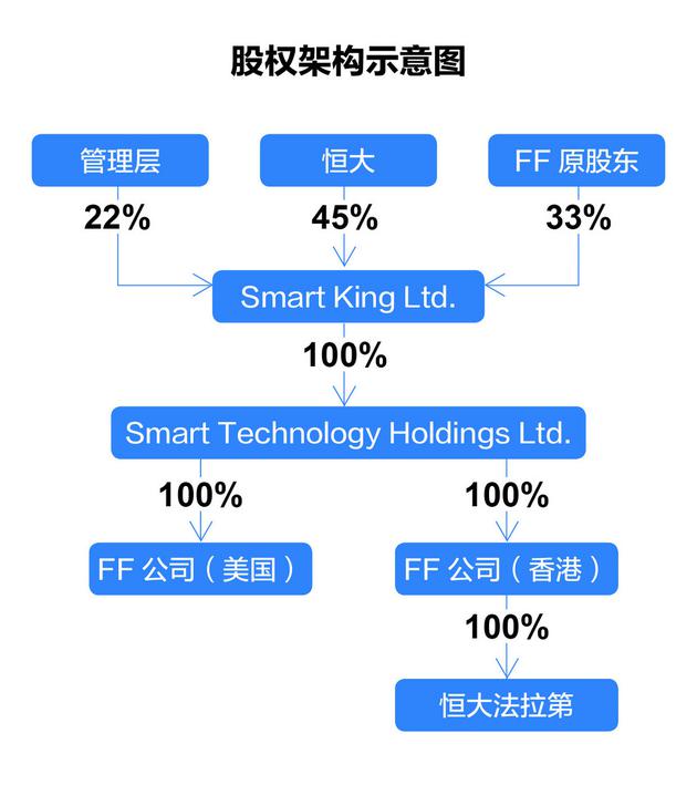 贾跃亭所求是FF的控制权。通过AB股的形式:恒大方面拥有45%的股份,但1股仅有1票的投票权;而贾跃亭持有FF 33%的股份,1股拥有10票的投票权。此条款确保贾跃亭虽不再是FF的大股东,但对公司保有绝对的运营权,包括在董事会、日常经营管理、投资大会等。董事会组成方面,FF方面也占据优势——拥有五个董事会席位,而恒大方面拥有两个席位。