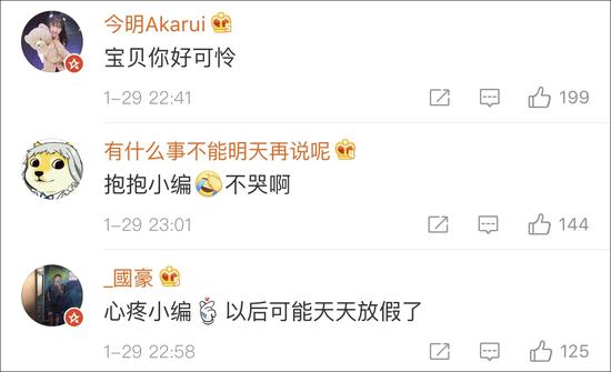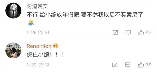 没有年假、加班写方案,网友们心疼小编的同时,又纷纷去索尼官微留言,不要开除小编,给他放个假吧,他只是想过年啊。