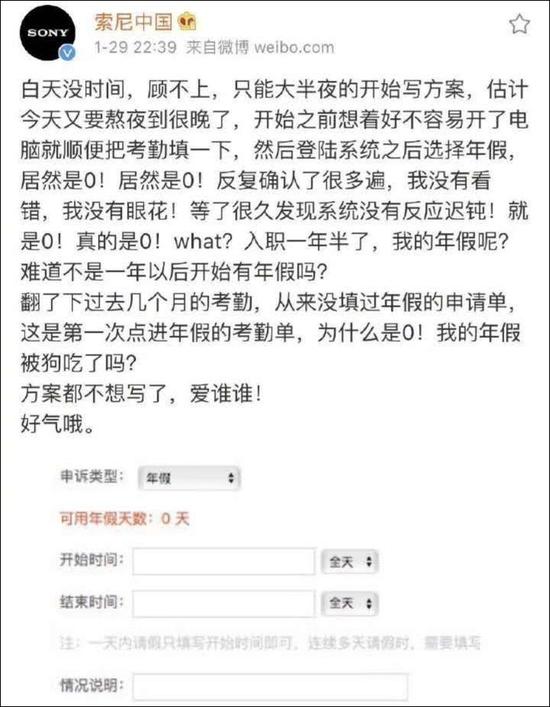29日晚,“索尼中国”的小编通过官方微博账号吐槽,晚上熬夜加班写方案不说,没想到工作一年半了,2019年的年假仍旧为0,“年假被狗吃了吗?”