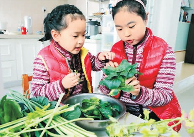 由于新冠肺炎疫情,小学生假期延长了。江苏省苏州市小学生们的宅家生活安排得丰富多彩,提高自己的生活自理能力和劳动技能。图为苏州工业园区星港学校五年1班小学生俞圣安正和妹妹俞隽安一起帮妈妈检菜。