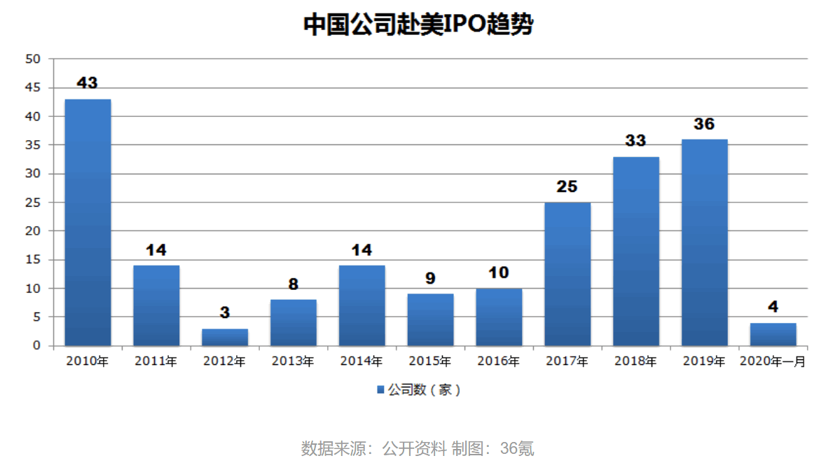 2010年-2012年,中概股在美国市场的信誉和投资价值受到普遍质疑,整体融资陷入冰冻期。36氪此前统计发现,赴美上市的中国公司在2012年时降至最低点。