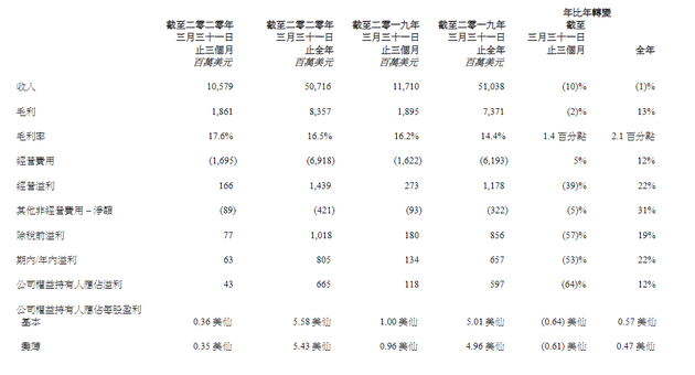 移动业务在19/20财年的营业额下降19.2%,达52.18亿美元,其中,年度下降的58%来自第四季度的供应短缺。移动业务占集团总营业额的10%。该业务的盈利能力比去年同期显著改善了9,600万美元。由于新冠肺炎导致营业额大幅减少的不利影响,促使该业务迅速采取了费用控制措施,从而使第四季度的税前亏损控制在6,000万美元,而全年的数字为4,300万美元。该业务在其两个最大的核心市场拉丁美洲和北美实现了健康的盈利能力。这两个地区的19/20财年的除税前溢利率均为正,盈利能力按年也有健康增长。在新冠肺炎之前,移动业务在拉丁美洲这个据点市场,虽然受到汇率波动的影响,仍然录得营业额的持续上升。然而,新冠肺炎造成供应方面的挑战和侧重于利润增长的战略导致各地区的年度营业额下降。