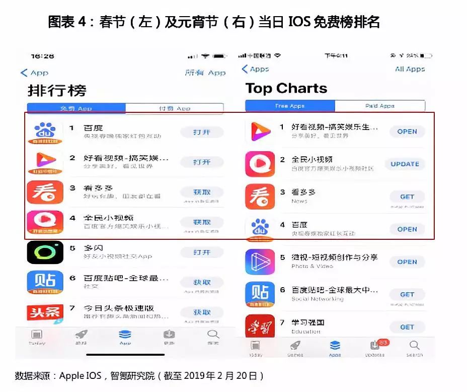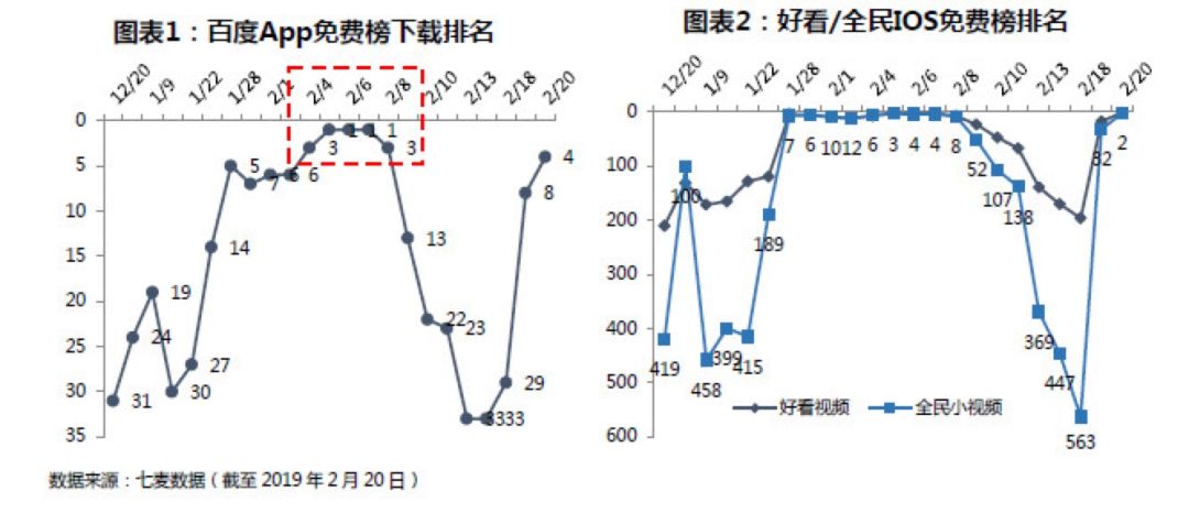 央视元宵晚会期间,百度再次发放2亿元红包,受此影响,百度APP及旗下好看视频、全民小视频、看多多再一次冲上了IOS免费榜的前列。(详见图表1-2)